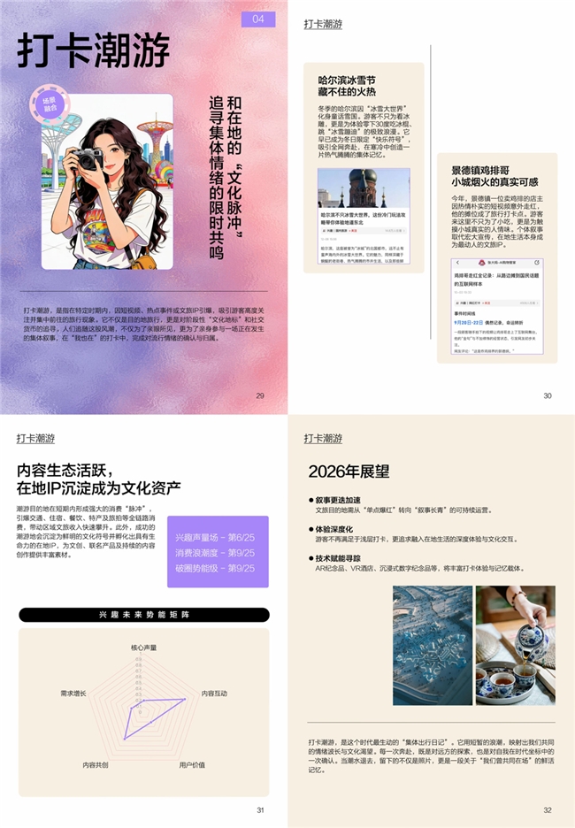 基于平台兴趣生态,报告构建了六大维度兴趣坐标系:技术驱动、精准适配、场景融合、绿色健康、文化赋能和手工造物,完整解码兴趣属性。其中,前三者代表了兴趣在技术赋能与消费形态互动中形成的“现代面向”;后三者则指向兴趣背后关乎健康、文化认同与创造表达的“永恒内核”。这一框架不仅完整映射了平台兴趣的属性谱系,也为理解兴趣消费的演变提供了结构化视角。