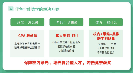 伴鱼全能数学之所以能成为直播带货中的 “顶流”,核心在于其差异化的产品竞争力。教学方法上,产品采用全球数学教育排名第一的新加坡 CPA 教学法,通过 “具象化 - 形象化 - 抽象化” 的三阶教学流程,让孩子轻松理解复杂数学概念,摆脱死记硬背的学习模式。课程体系上,创新性地实现 “校内 + 思维 + 奥数” 三位一体的有机融合,一个课程即可满足孩子巩固校内知识、培养核心思维、冲击竞赛获奖的多重需求。大量跨学科场景的融入,更能提升孩子的综合素养,助力其成长为具备国际视野的复合型人才。