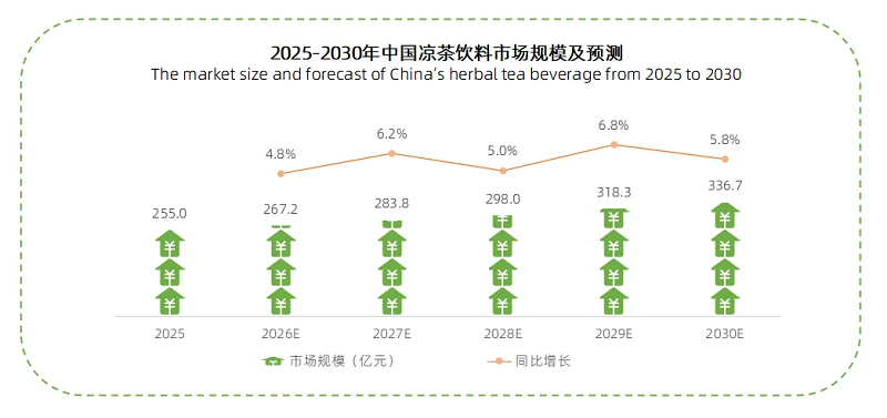 iiMedia Research(艾媒咨询)发布的《2026年中国凉茶饮料消费趋势洞察白皮书》数据显示,2025年中国凉茶饮料市场规模达255.0亿元,预计2030年将达到336.7亿元。[1]随着人们逐渐将“健康”与“美味”放在同等重要的位置,凉茶这一细分品类,闯出了一条百亿赛道。