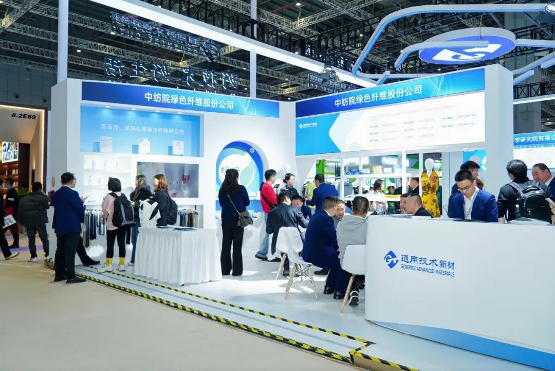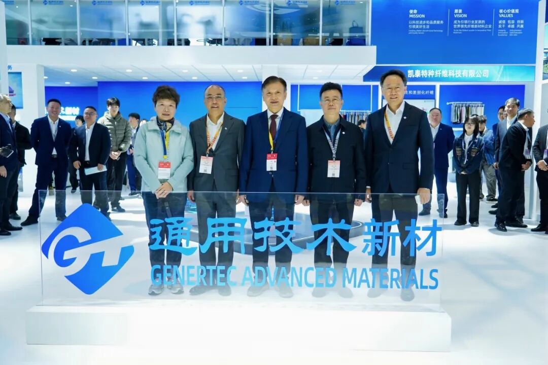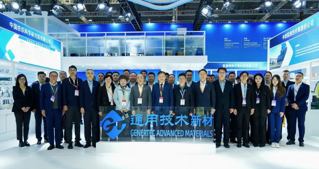 展会现场,中国纺织工业联合会副会长李陵申,中国工程院院士、生物基纤维材料全国重点实验室主任程博闻,中国纺织工业联合会专家咨询委员会委员曹学军、贺燕丽,中国化学纤维工业协会会长陈新伟,中国纺织机械协会会长顾平,中国纺织工业联合会研究室(非遗办)主任华珊,中国化学纤维工业协会副会长靳高岭,中国化学纤维工业协会原副会长姜俊周等领导莅临展位,期间围绕新技术与新产品研发进展、实际应用场景及未来市场推广进行了深入交流。通用技术新材董事长、党委书记、总经理姜俊华,副总经理于捍江、李开占,集团派驻通用技术新材股权董事朱北娜,通用技术中纺院副总经理崔桂新等陪同参观并进行了详细介绍。