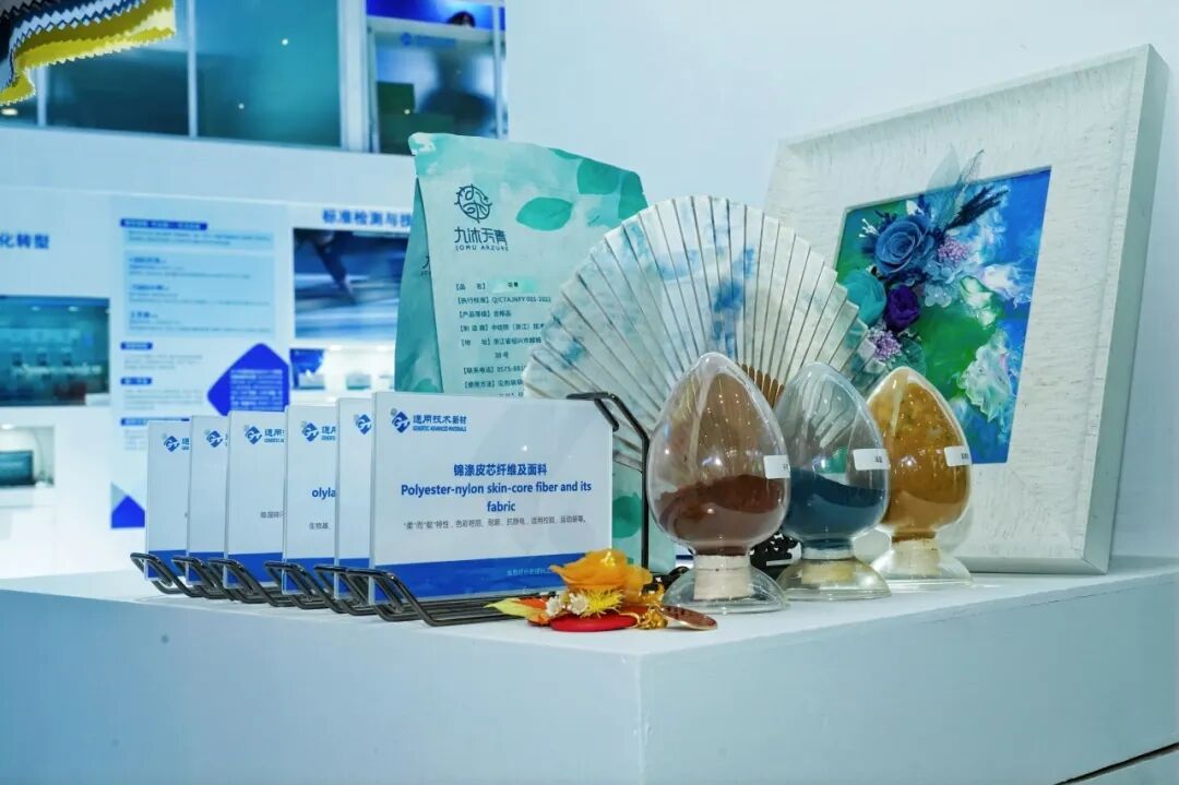 展示功能系列与生态植物染系列两大产品线。功能系列包括复用手术服、轻质高强、防刺防割等功能面料;植物染系列涵盖从染料提取到生活艺术品创作的全过程,融合非遗技艺与现代设计。