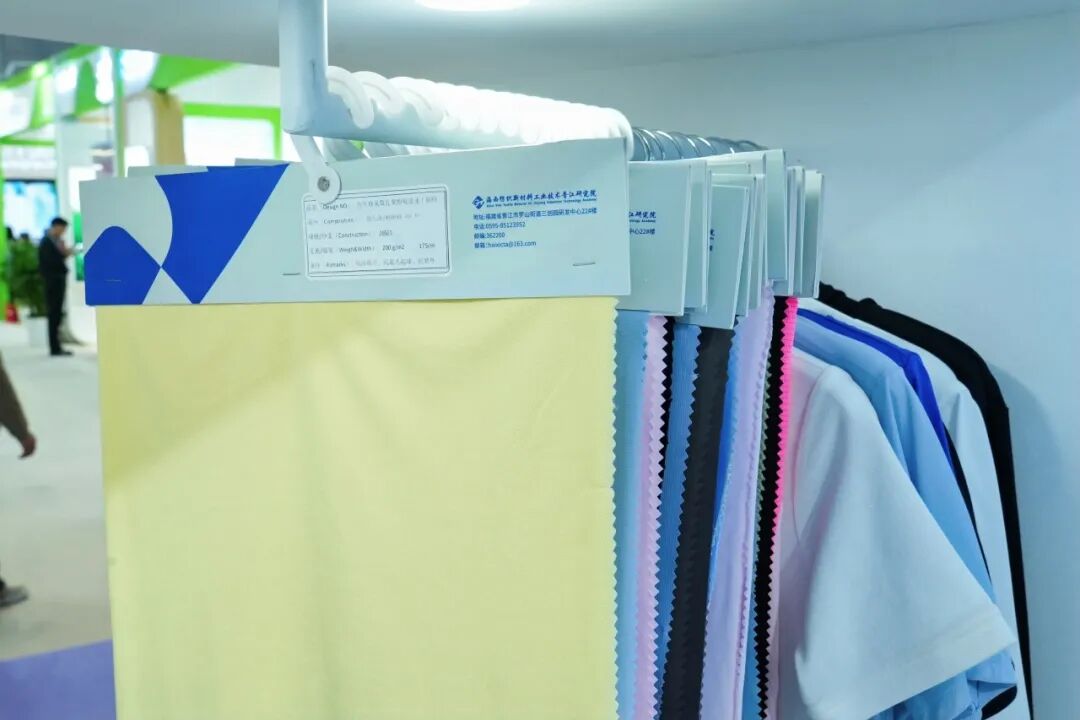 携子公司福建海纺新材料科技有限公司展出仿生蜂巢微孔聚酯吸湿速干纤维、凉感遮热复合纤维、锦涤皮芯超级黑无尘纤维、聚乳酸抗菌复合纤维及其制品,以及护士服、工装厂服等15款新品。其中,凉感遮热复合纤维以“凉感+遮热+可染”三重优势,成为夏季功能性面料研发的亮点产品。