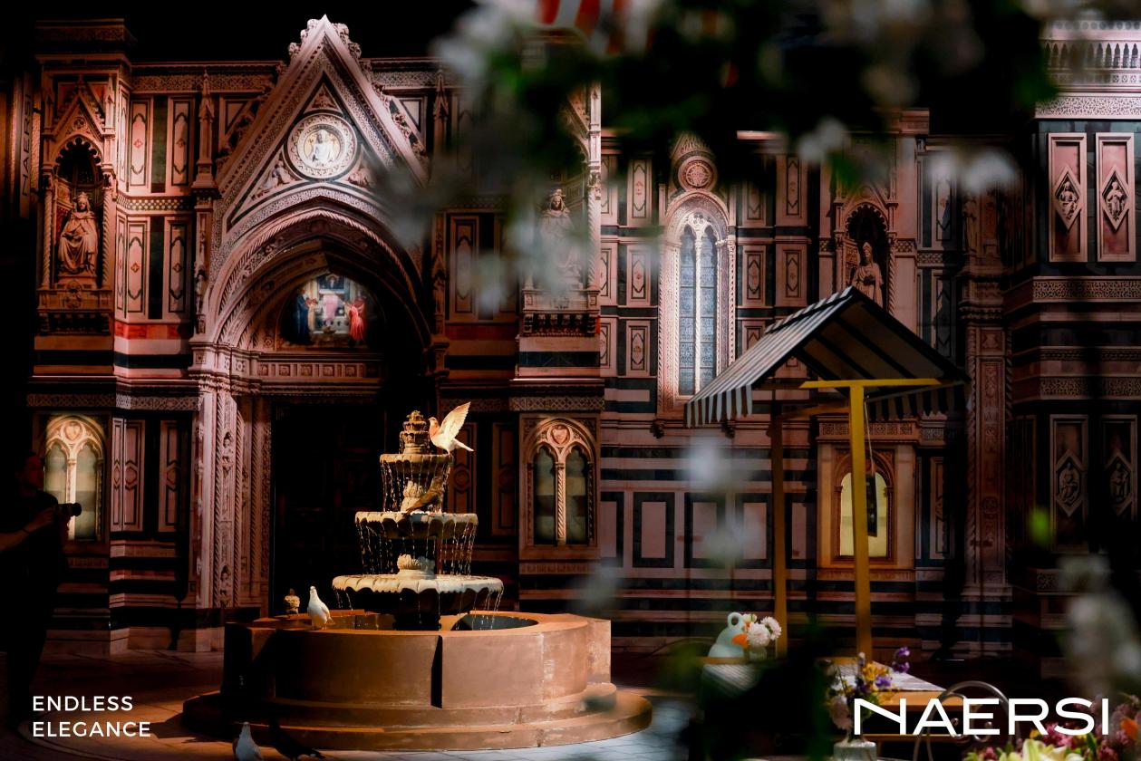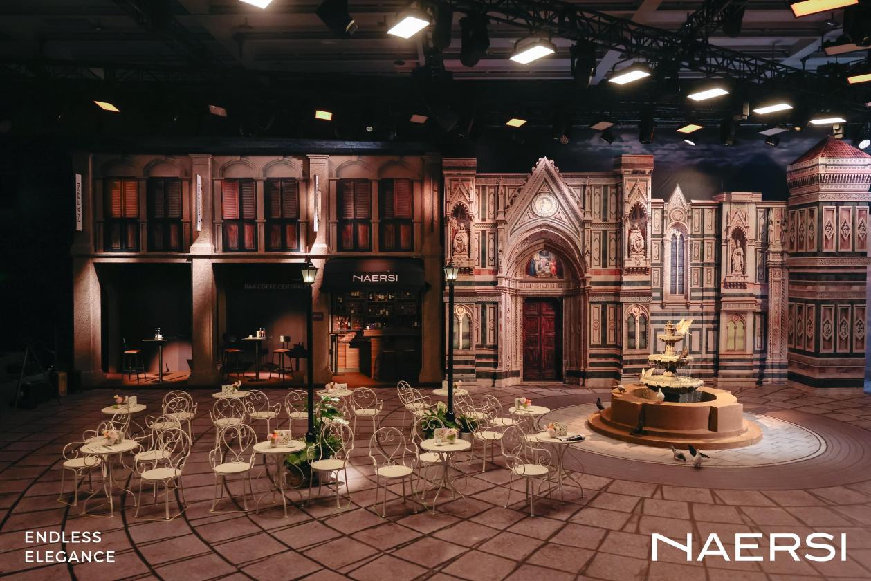 大秀选址于由世界级建筑大师保罗·安德鲁概念设计的北京星地艺术中心。形如巨鲸、轻盈灵动的建筑线条,为时尚叙事提供了独特的空间语言。作为赢家时尚集团旗下的核心品牌,NAERSI此次将佛罗伦萨的文艺复兴精髓在现场华丽重现,沿秀道铺陈意式沉浸街区——名品街的优雅橱窗、圣百花大教堂的穹顶光影、街角咖啡馆的闲适气息交织呈现。这种将顶级艺术地标与品牌文化叙事深度融合的能力,体现了赢家时尚集团作为时装领军企业在资源整合与品牌运营上的雄厚实力与行业远见。