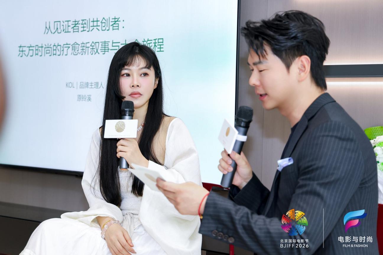 在主持人李海龙与时尚艺术博主原铃溪的对谈中,他们分享了东方美学在时尚领域和消费领域的变化感受。原铃溪认为:“时代的发展让美学不再是由上至下的‘报道’,而是变成了由下至上的‘分享’ ,而消费从原先‘符号’的占有,升级到现在为了‘感受’的共鸣。年轻一代在快节奏的都市生活中感官是超载的,他们寻找的东方美学不再是喧哗的视觉冲击感,而是一种隐性的精神上的庇护。东方美学的未来,不在于我们说了多大的故事,而是让我们共同成为那个 “摆渡人” ,将古老的东方智慧,渡给每一个渴望美好、宁静的现代灵魂。以敬畏心做产品,以真诚意做内容。”